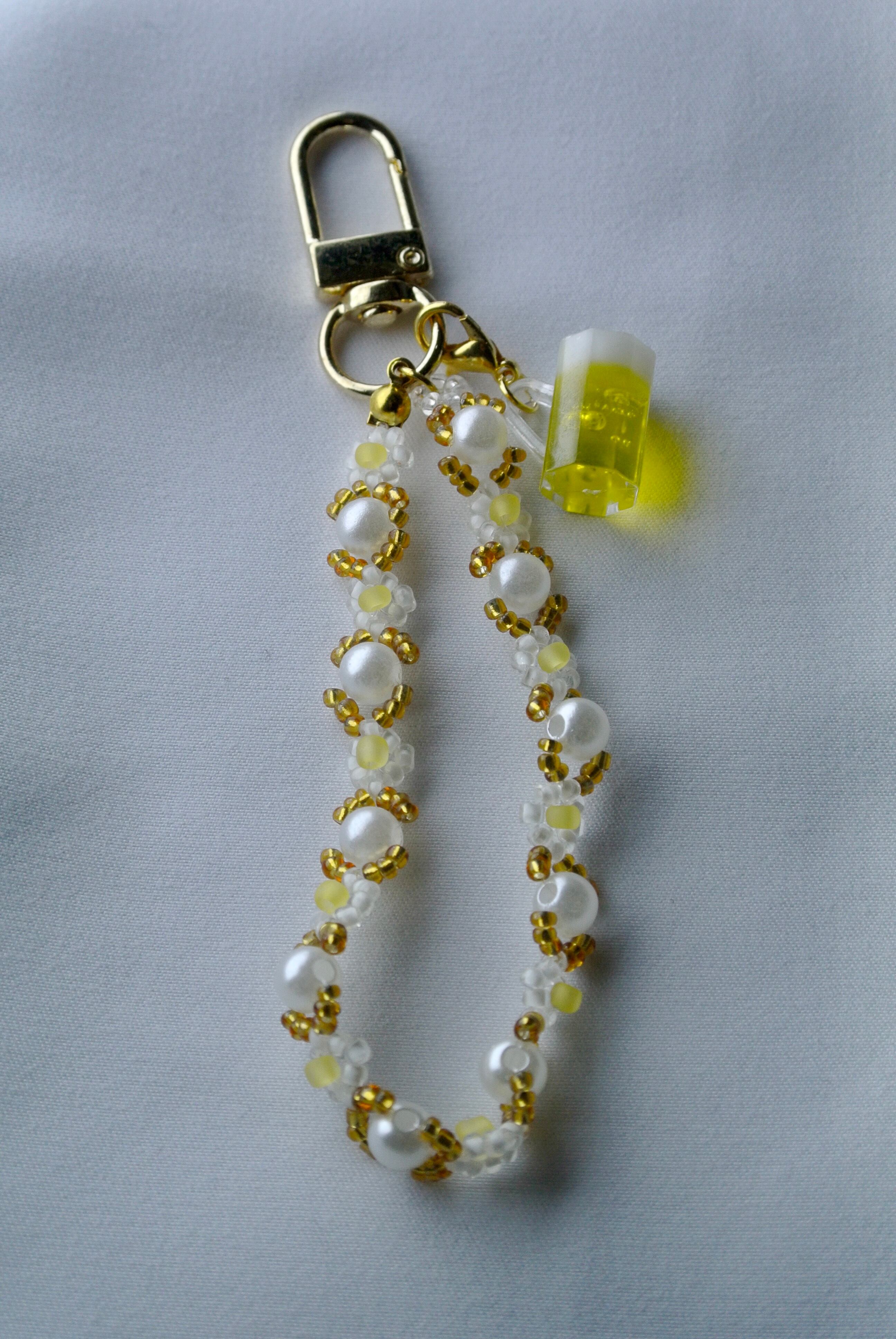 ビールな色合いのキーチャーム。ふわふわでオーロラのかかった泡と、黄金色でシュワシュワ弾けるビールを、その日の愛で仕上げた一点ものです。