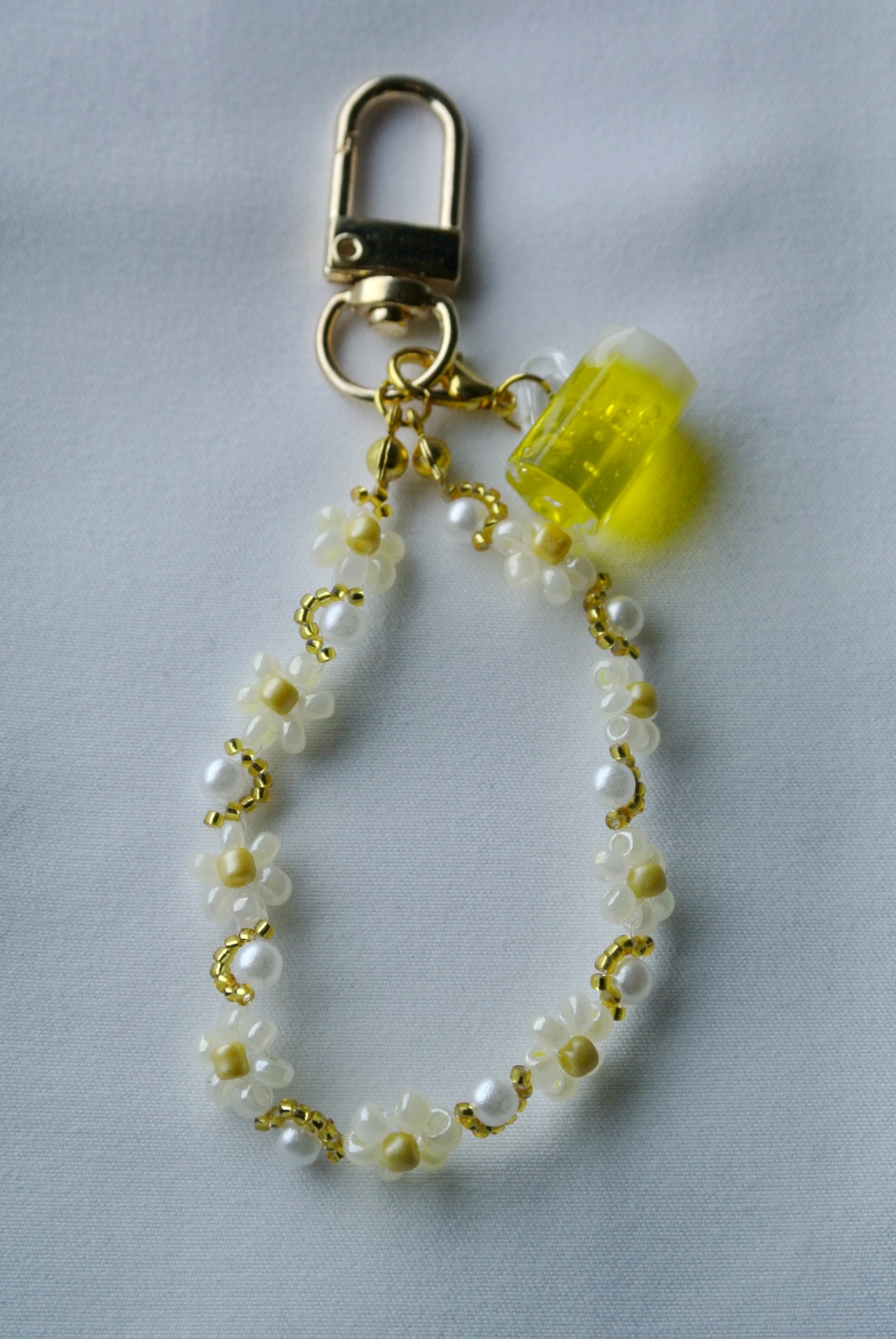 ビールな色合いのキーチャーム。ふわふわでオーロラのかかった泡と、黄金色でシュワシュワ弾けるビールを、その日の愛で仕上げた一点ものです。