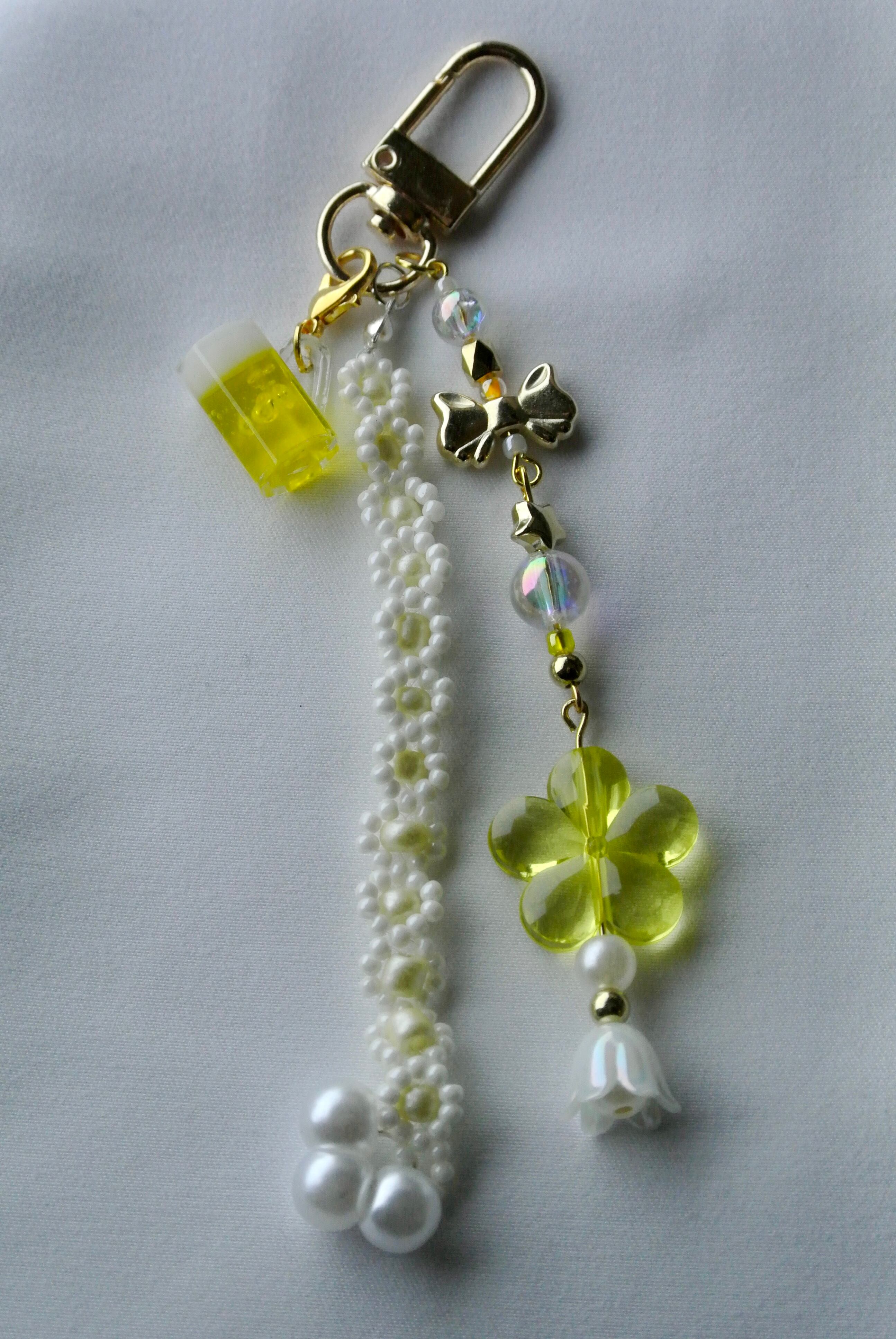 ビールな色合いのキーチャーム。ふわふわでオーロラのかかった泡と、黄金色でシュワシュワ弾けるビールを、その日の愛で仕上げた一点ものです。