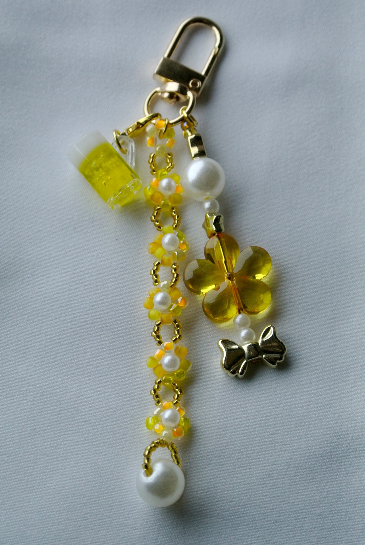 ビールな色合いのキーチャーム。ふわふわでオーロラのかかった泡と、黄金色でシュワシュワ弾けるビールを、その日の愛で仕上げた一点ものです。